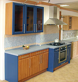 Některé elementy této kuchyně se vyrábějí v barvě modré a lze je kombinovat se všemi třemi barevnými odstíny. Nejpoužívanější kombinace modrých dvířek je s bukem nebo olší.